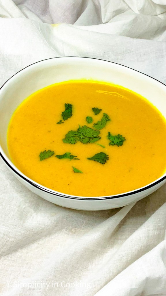 Suppe zurück in den Topf geben nochmals aufkochen und vor dem Servieren mit Koriander garnieren.